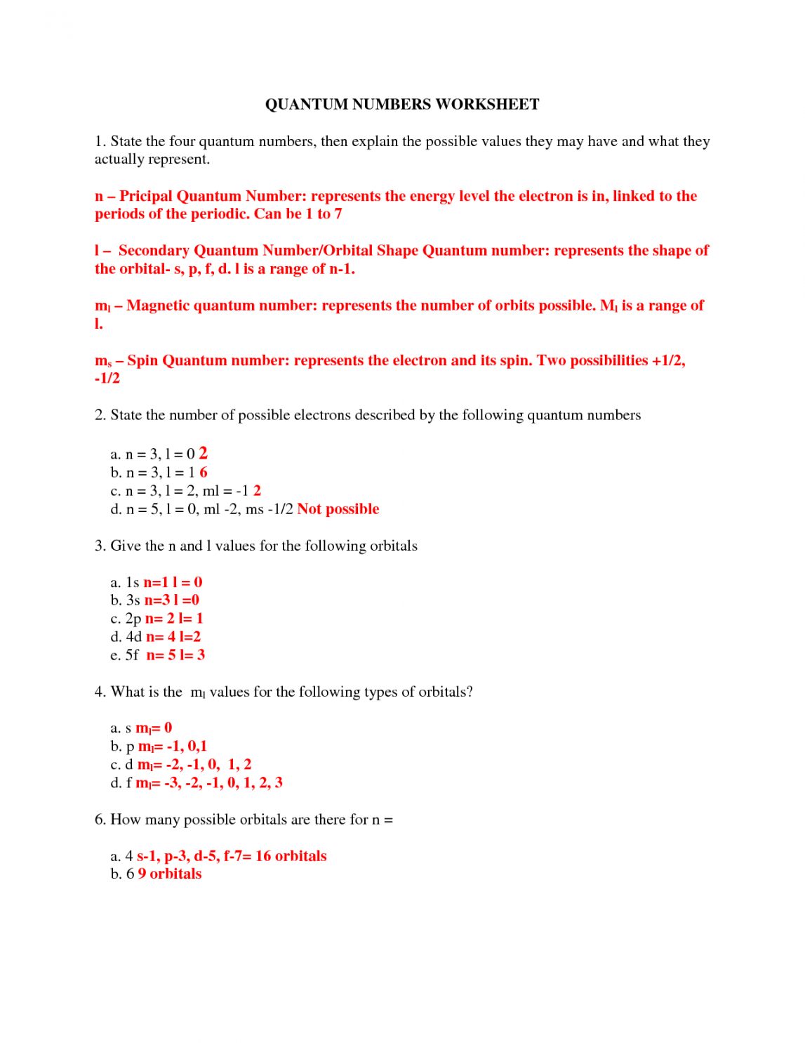 A quantum numbers practice worksheet provides a structured way for students to test their knowledge and problem-solving skills. By working through various exercises and problems, students can enhance their ability to determine the quantum numbers for different electron configurations and energy levels. This hands-on approach helps reinforce the theoretical concepts learned in the classroom and allows students to apply their knowledge in practical scenarios.