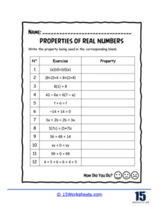 By practicing with a real numbers properties worksheet, you can improve your mathematical skills and deepen your understanding of how real numbers behave in different operations. These exercises provide a structured way to review and apply the properties of real numbers, helping you become more proficient in solving mathematical problems.