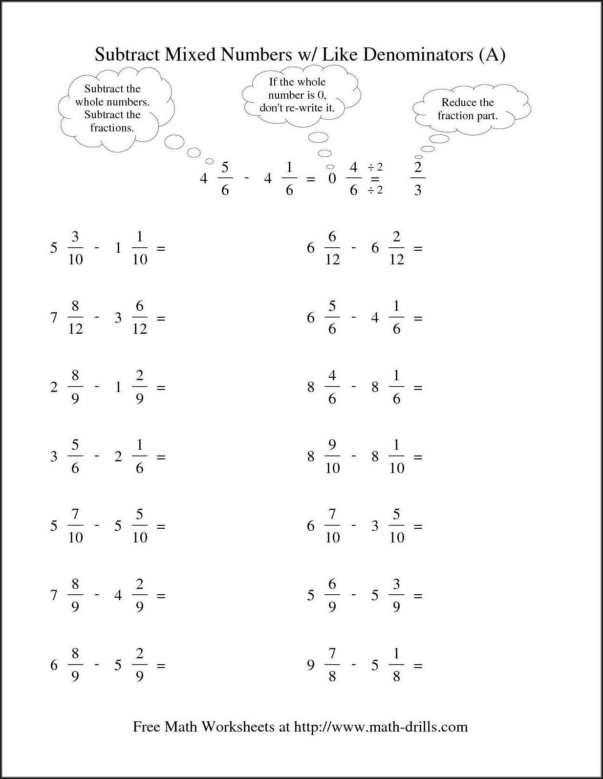 By providing students with a variety of subtraction problems to practice on worksheets, teachers can assess their understanding and provide targeted support where needed. Students can work independently or in groups to solve the problems, discussing their strategies and reasoning with their peers. This collaborative approach can help students deepen their understanding of subtracting mixed numbers with regrouping.