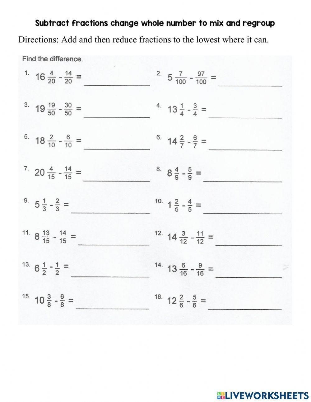 These worksheets typically include a mix of whole numbers and fractions, requiring students to borrow from the whole number if necessary when subtracting the fractions. By providing students with practice problems in a structured format, they can develop their skills and build confidence in their ability to subtract mixed numbers with regrouping.