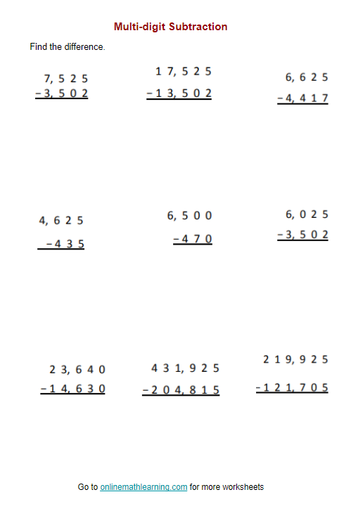 These worksheets typically consist of multiple problems that vary in difficulty, ranging from simple two-digit subtraction to more complex problems involving three or more digits. Students are required to carefully subtract each digit, borrow when necessary, and regroup to find the correct answer.