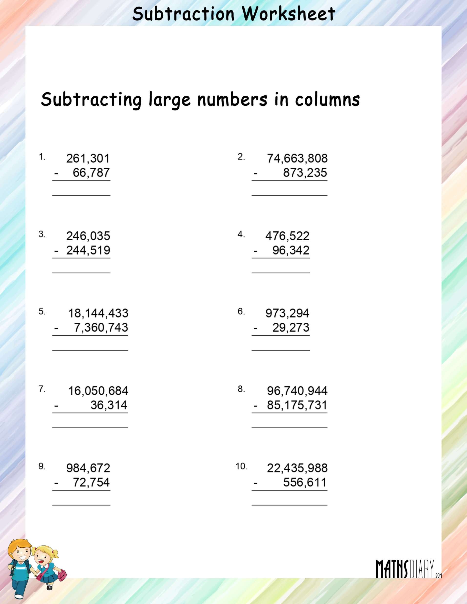 Subtracting large numbers can be a challenging task for students, especially when dealing with multiple digits. To help students master this skill, teachers often provide them with worksheets that contain various subtraction problems involving large numbers. These worksheets not only help students practice their subtraction skills but also improve their mental math abilities.