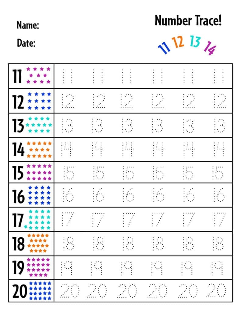 Another type of worksheet for numbers 11-20 is a tracing activity. Children can practice writing the numbers 11-20 by tracing over them on the worksheet. This helps children improve their fine motor skills while also reinforcing their number recognition and writing abilities.